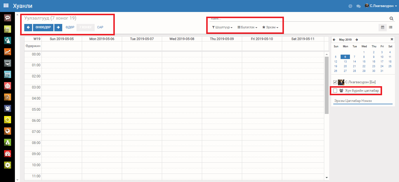 Та хуанли аппликейшннэ рүү хандаж уулзалтуудаа календарт хөтлөх боломжтой. Хуанлын харагдацыг өдөр, 7 хоног, Сараар харагдуулж болно. Мөн шүүлтүүр хийж олон төрлөөр харах боломжтой. Хүн бүрийн цаглабар дарсанаар бусад дотоод ажилчдын товлосон төлөвлөгөө уулзалтууд харагдана