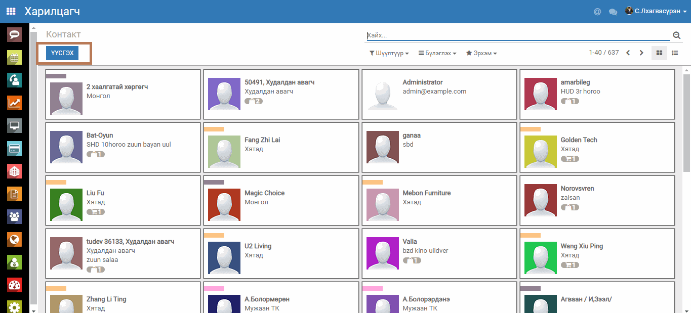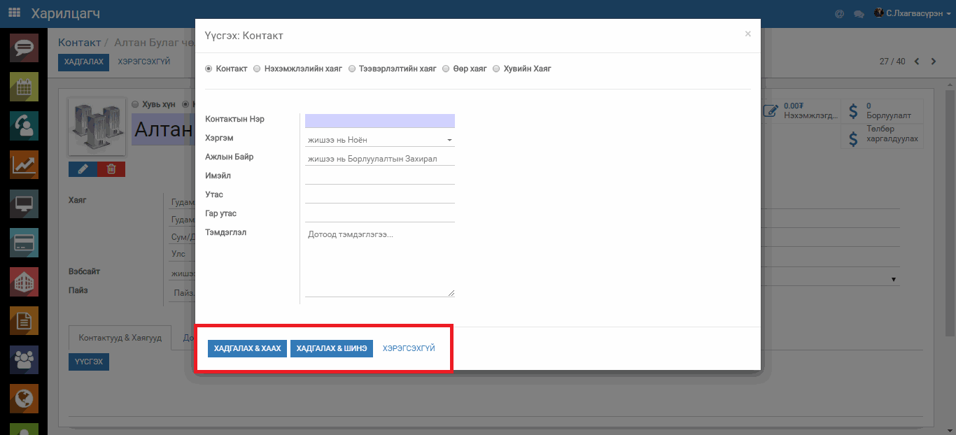 Харилцагч үүсгэхийн тулд харилцагч аппликейш рүү хандаж үүсгэх дарж шинэ харилцагчийн мэдээлэл оруулах цонх гарч ирнэ.