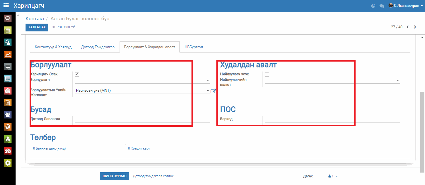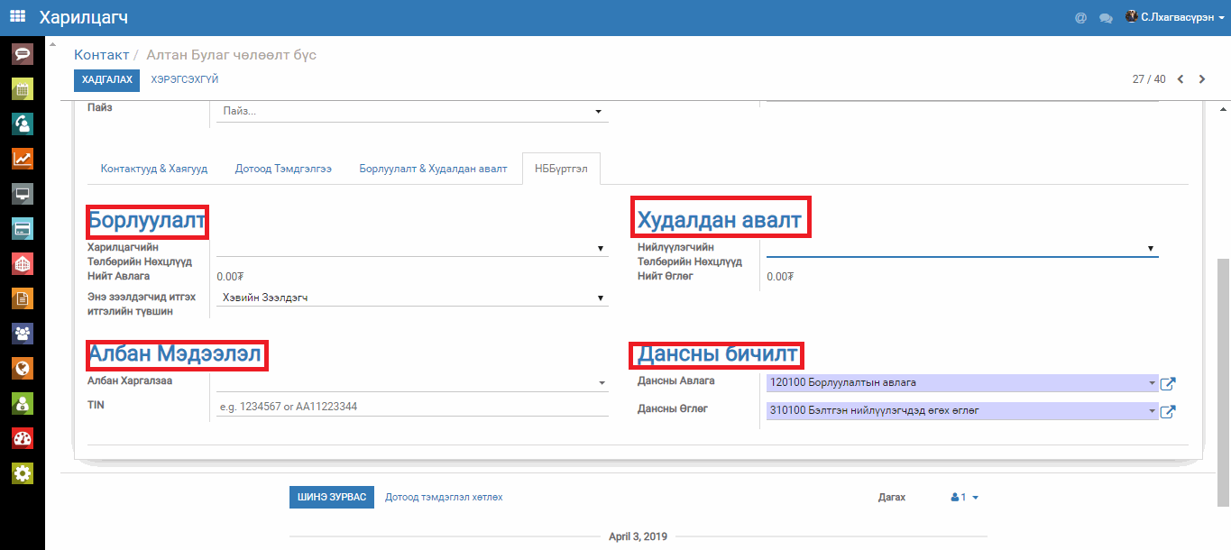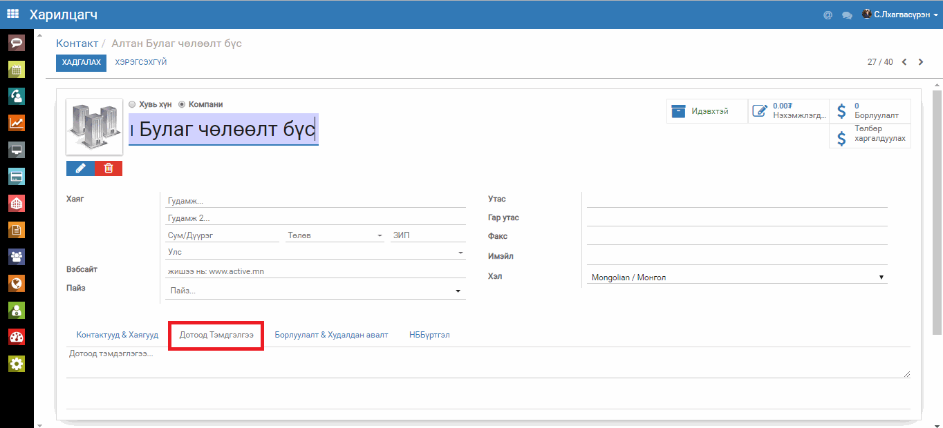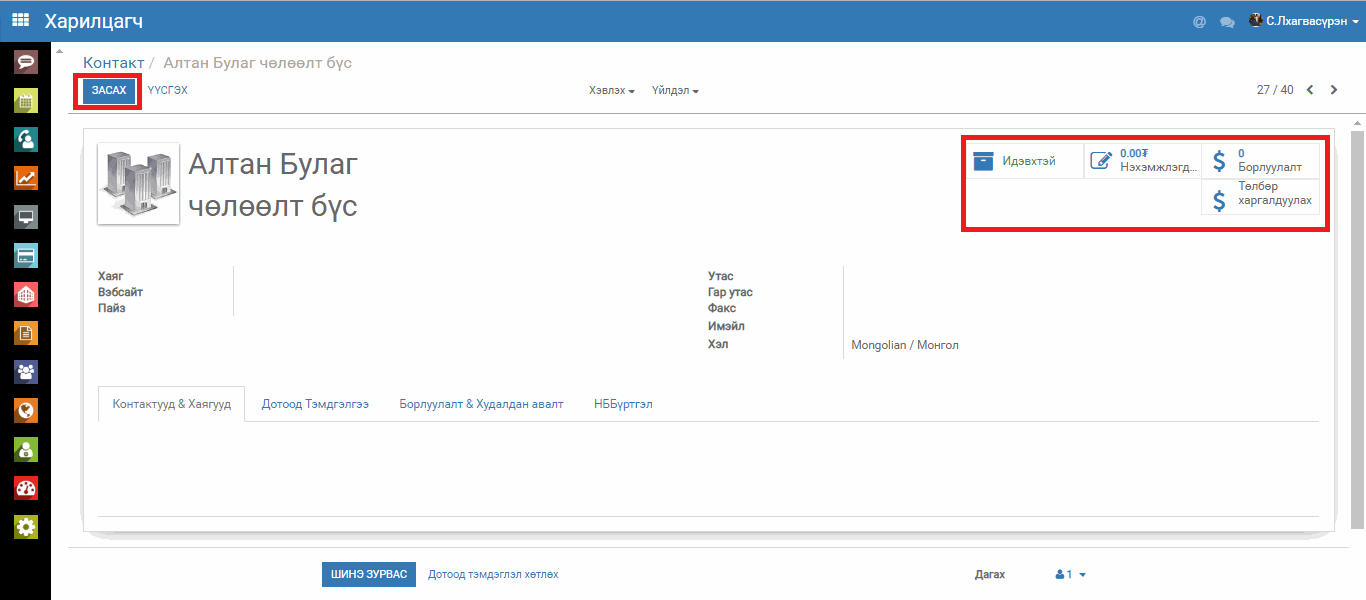 Харилцагчийн мэдээллийг бүрэн оруулж хадгалах дарсанаар харилцагч бүртгэгдэнэ. Бүртгэсэн харилцагчийн мэдээллийг засах боломжтой. Баруун дээд булан энэ харилцагч идэвхтэй гэсэн мэдээлэл байгаа та харин идэвхгүй болгох боломжтой. Ямар үед идэхгүй болгох вэ? Ихэнхдээ харилцагч дээр худалдан авалт, борлуулалт хийгдсэн эсвэл ямар нэгэн байдлаар тооцоотой боловч энэ харилцагчийг ашиглахгүй гэсэн тохиолдолд хэрэглэнэ. Харилцагчийн нэхэмжлэл болон Борлуулат хэсгийг Борлуулалтын гарын авлагаас уншина уу. Харилцагч дээр гарч байгаа нэхэмжлэл, борлуулалт нь зөвхөн энэ харилцагчтай хийгдсэн тул та энэ харилцагчтай хийгдсэн борлуулалт болон худалдан авалтыг харах боломжтой. Харин төлбөр харгалдуулах хэсэг нь харилцагчийн төлбөр тооцоог НББ-ын дебет кредитээр данс бүр дээр харуулсан учир тооцооны мэдээллийг харилцагч хэсгээс авах боломжтой. Гэхдээ энэ хэсэгт нээлттэй тооцоо харагдах болно.